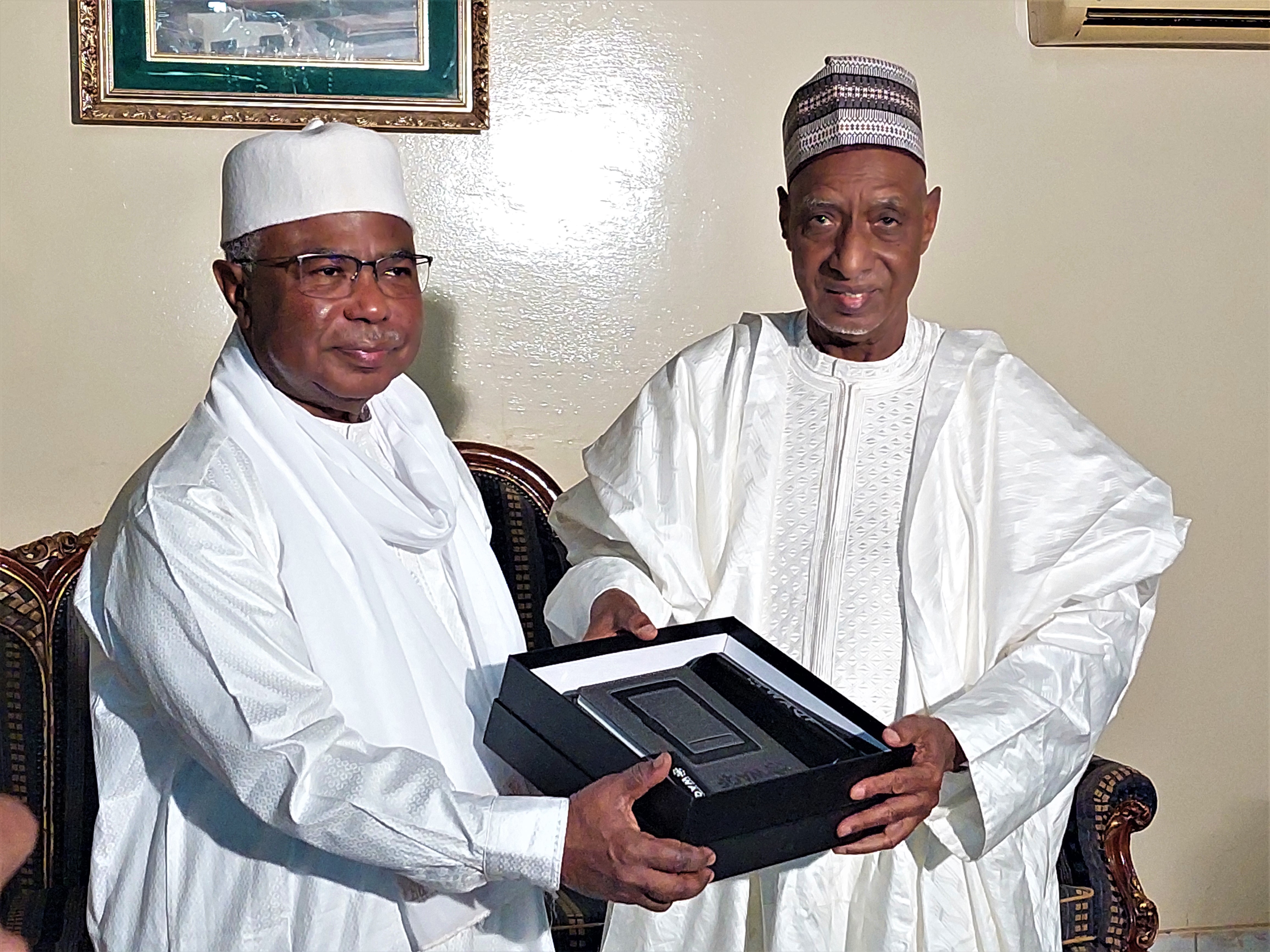 En visite de travail au Niger, S.E.M Hissein Brahim Taha, nouveau Secrétaire Général (SG) élu de l'organisation de la Coopération Islamique ( OCI), a effectué une visite de courtoisie à Dr Hamid ALGABID, ancien SG de l'OCI et actuel Président du Conseil d’Orientation et de Contrôle de la Haute Autorité du Waqf (HAWaqf), ce jour 8 mars 2022.