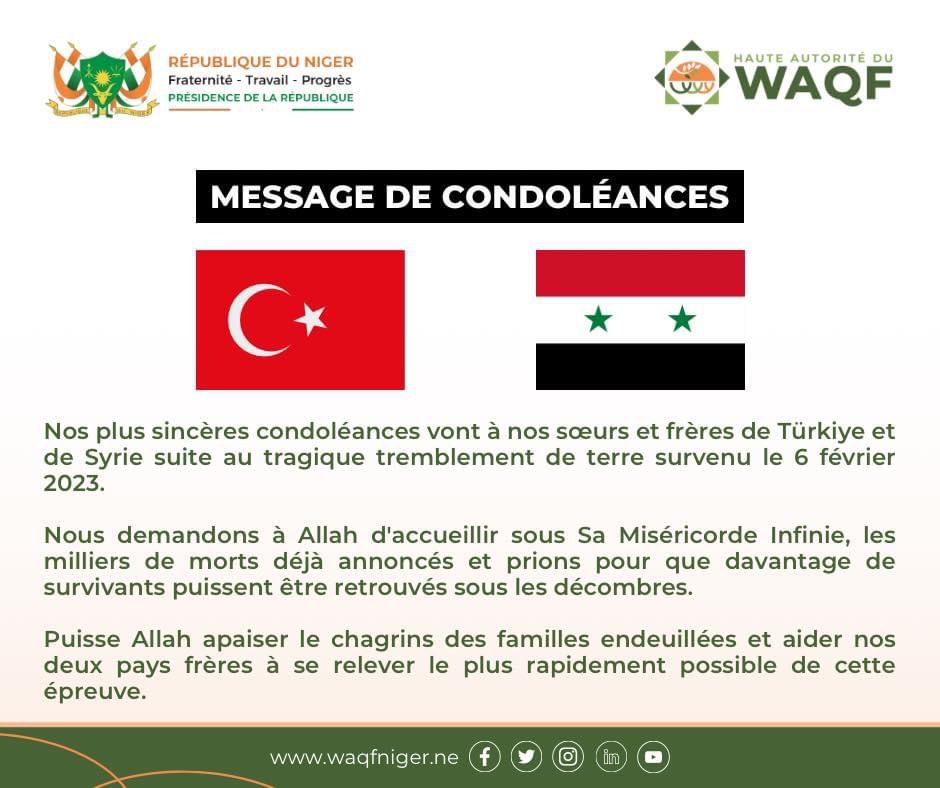 Message de condoléances adressé à nos sœurs et frères de Türkiye et de Syrie éprouvés par un tragique tremblement de terre survenu le 6 Février 2023. T.C. Niamey Büyükelçiliği/ Ambassade de Türkiye à Niamey Présidence De La République Du Niger #türkiye #Syrian #Earthquake #Séisme #Catastrophe #TremblementdeTerre #CatastropheNaturelle